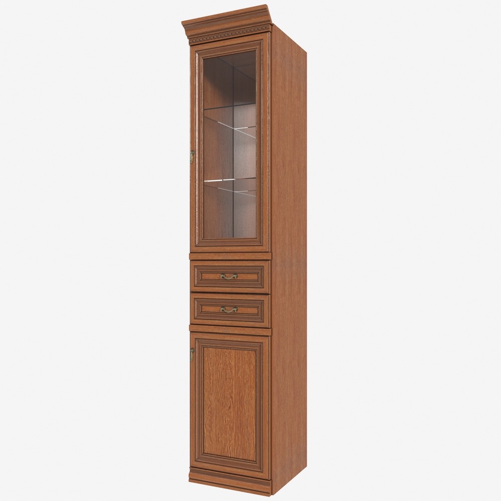 Модуль однодверный из коллекции «Екатерина Премиум» с корпусом из ДСП, облицованным натуральным шпоном дуба. Фасады рамочные: профили из МДФ с отделкой шпоном и стеклянными вставками или глухие с вставкой из шпонированного МДФ. Вручную нанесенная коричневая патина создает эффект старения древесины. Покрытие итальянским лаком защищает от механических воздействий. Фурнитура в цвете «бронза античная», петли оснащены доводчиками, а шариковые направляющие обеспечивают плавное открывание ящиков.