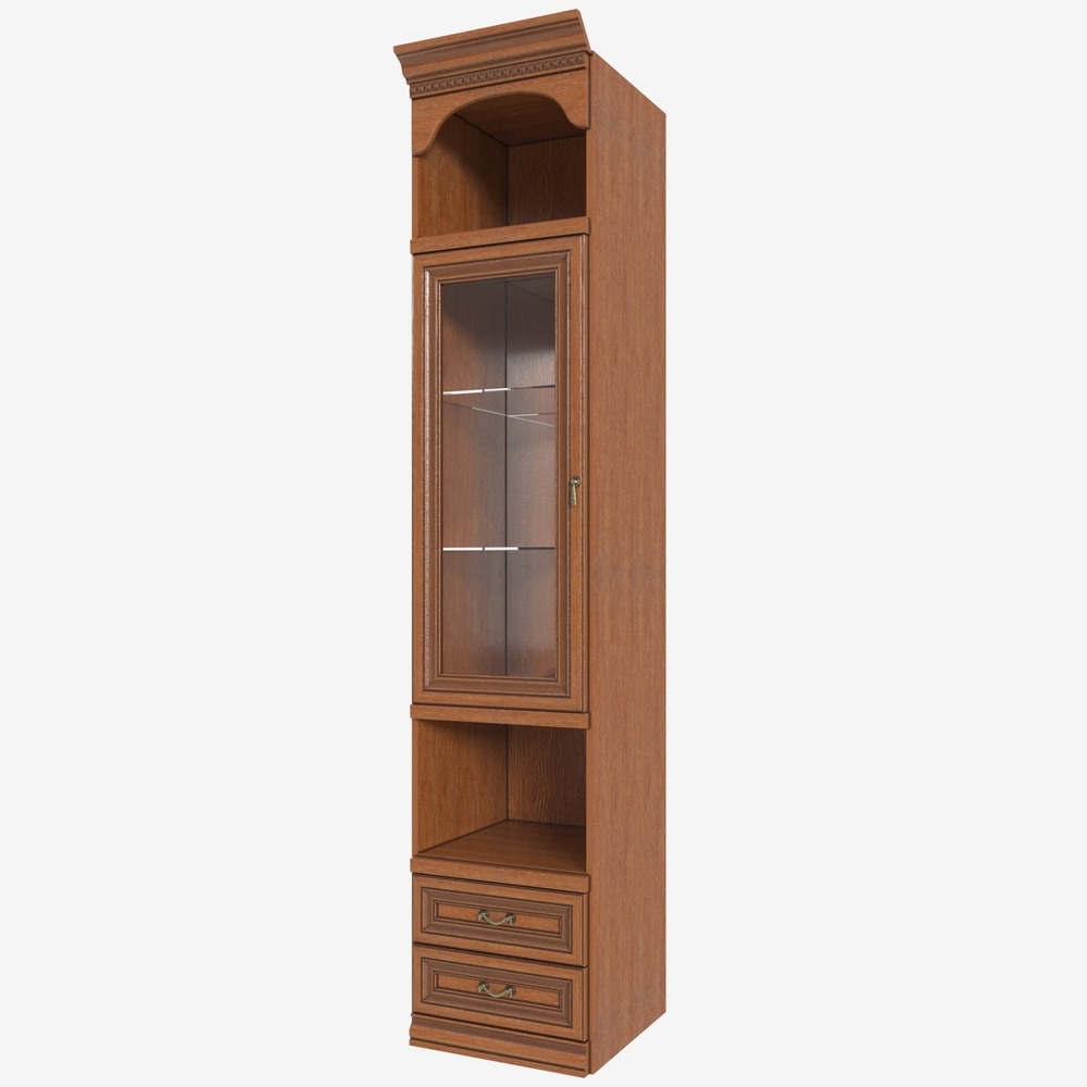 Модуль однодверный из коллекции «Екатерина Премиум» с корпусом из ДСП, облицованным натуральным шпоном дуба. Фасады рамочные: профили из МДФ с отделкой шпоном и стеклянными вставками или глухие с вставкой из шпонированного МДФ. Вручную нанесенная коричневая патина создает эффект старения древесины. Покрытие итальянским лаком защищает от механических воздействий. Фурнитура в цвете «бронза античная», петли оснащены доводчиками, а шариковые направляющие обеспечивают плавное открывание ящиков.