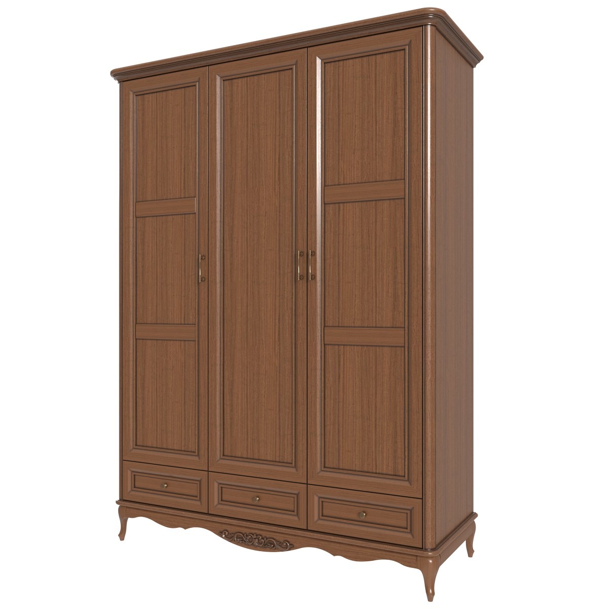 Элегантный шкаф с тремя дверями, выполненный из натуральных материалов. Корпус и фасады облицованы шпоном дуба, карнизы и крышки окрашены патиной цвета орех или беленого дуба. Внутренние элементы из ЛДСП дополняют конструкцию, а декоративные элементы из полимерного композита придают изысканности.